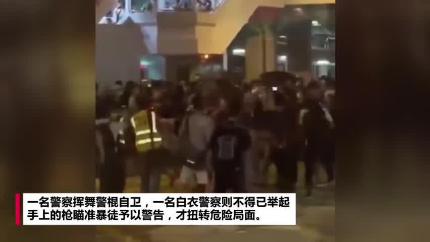 在这段视频中,BBC宣称一名身着白衣的香港警察在被抗议者“包围”(Surrounded)后,便掏出枪对准了抗议者。