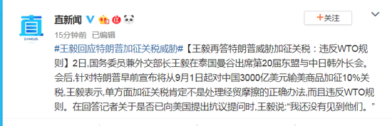 2日,国务委员兼外交部长王毅在泰国曼谷出席第20届东盟与中日韩外长会。会后,针对特朗普早前宣布将从9月1日起对中国3000亿美元输美商品加征10%关税,王毅表示,单方面加征关税肯定不是处理经贸摩擦的正确办法,而且违反WTO规则。在回答记者关于是否已向美国提出抗议提问时,王毅说:“我还没有见到他们。”