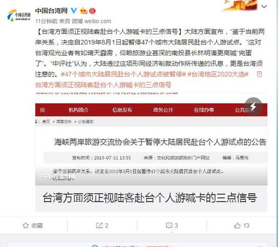 原标题:台湾方面须正视陆客赴台个人游喊卡的三点信号