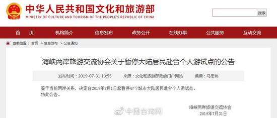 香港“中评社”8月1日发表社评文章指出,大陆方面宣布,“鉴于当前两岸关系,决定自2019年8月1日起暂停47个城市大陆居民赴台个人游试点。”这对台湾观光业者有如晴天霹雳,仰赖旅游业甚深的南投县长林明溱更高喊“完蛋了”。“中评社”认为,大陆透过这项形同经济制裁动作所传递的讯息,更是台湾须注意的。