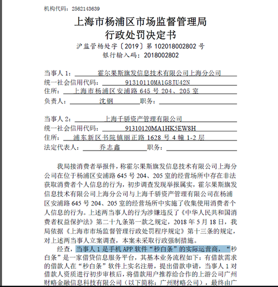 上海市杨浦区市场监督管理局最终对“秒白条”实际运营商开出10万元的行政罚单、对千骄资产开出5万元罚单。