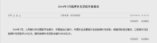 新浪财经讯 8月1日消息,2019年7月,人民银行未对国家开发银行、中国进出口银行、中国农业发展银行发放抵押补充贷款。根据贷款偿还情况,三家银行归还抵押补充贷款共103亿元。期末抵押补充贷款余额为35028亿元。