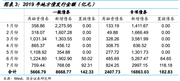 7月发行的新增专项债仍以棚改专项债和土储专项债为主,两者合计占项目收益债比重为64.49%,收费公路专项债占比为11.55%,6月16日出台专项债新规后,内蒙古自治区发行的“2019年内蒙古自治区政府专项债券(10-17期)” 披露的呼和浩特新机场项目和集大高铁项目都发行专项债作为资本金,同时采用“债贷组合”的配套融资模式,我们在前期报告《财政能否更积极?基建发力尚可期?》中对两个项目募集资金来源及对基建的拉动作用进行了具体分析。