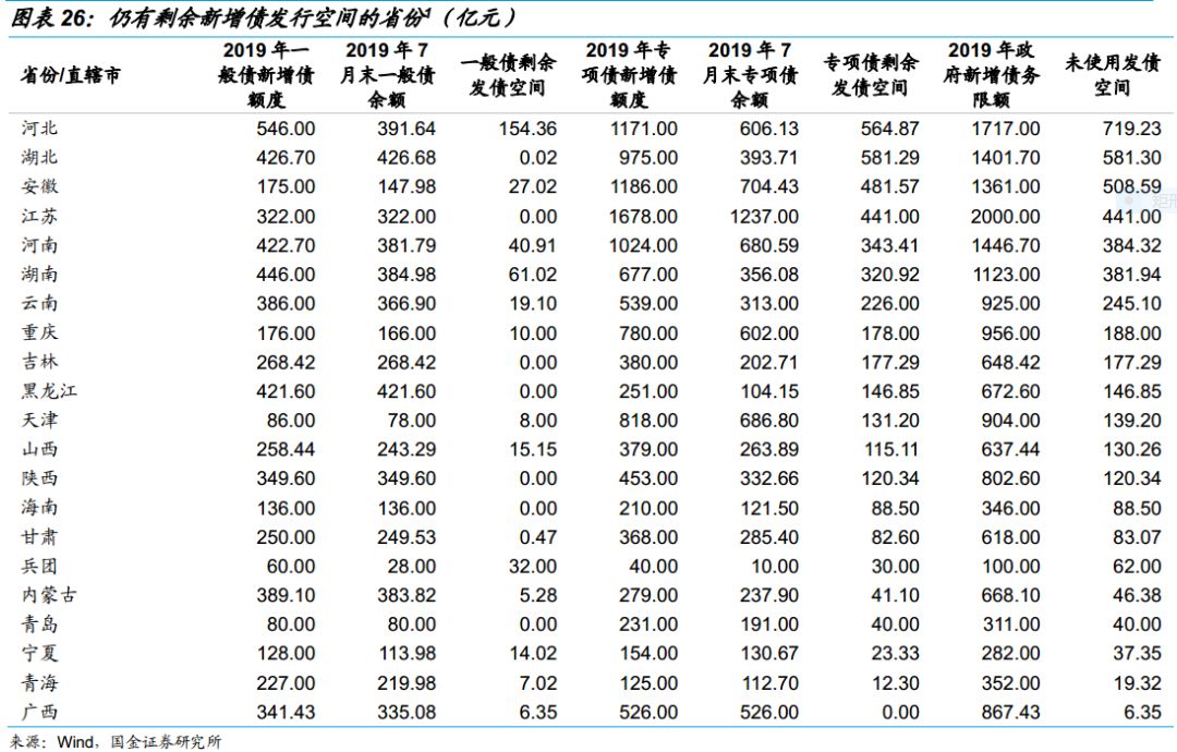2019年1-7月,各省份新增一般债共发行8,668.77亿元,新增专项债共发行16,863.03亿元,从各省份的发行进度来看,河北省、湖北省、安徽省、江苏省、河南省剩余发债空间排名前五,多个省份全年新增发债额度已使用完毕。另外,我们对年内地方债发行规模进行测算,总体来看,7月份新增地方债发行规模冲高回落,但仍处于高位,年内地方债供给压力在一定程度上有所缓解。