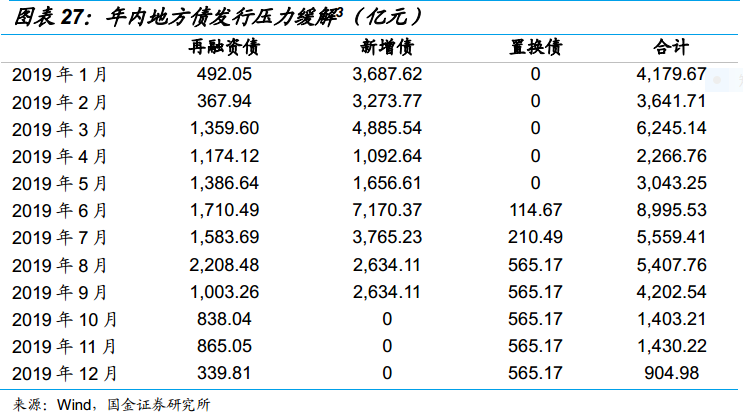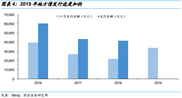 根据财政部披露,截至2019年1月末,非政府债券形式存量政府债务还有3,151亿元,假设这3,151亿元债务均于今年置换为政府债券,7月份已发行210.49亿元,8-12月每月仍需发行565.17亿元。但根据2019年《政府工作报告》中“继续发行一定数量的地方政府置换债券,减轻地方利息负担”,后续不排除在债务限额内继续发行置换债置换或有债务。[2]