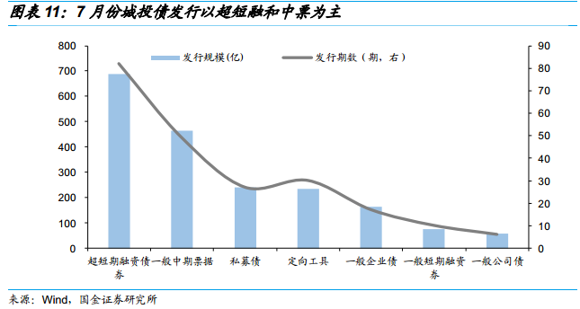 从债券类型来看,7月份超短期融资券和一般中期票据占比较高,分别上升36.81%和28.03%,其中超短融共发行82期,发行总额为689亿元,占比35.87%,一般中期票据共发行49期,发行总额为465.5亿元,占比24.24%。