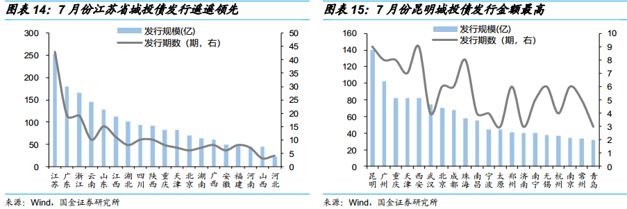 从城投债发行主体分布区域看,7月份新发行的城投债中,江苏省发行规模仍保持领先地位,为253亿元,占总发行金额13.17%,列发行省份第一位。此外,广东、浙江、云南、山东、江西、湖北、四川、陕西、重庆、天津、北京、湖南、广西发行金额均超过60亿元。城市分布方面,除直辖市外,昆明、广州、天津发行规模位列前三,发行金额均超过80亿元,其中昆明市的发行额最高,达到140亿元。