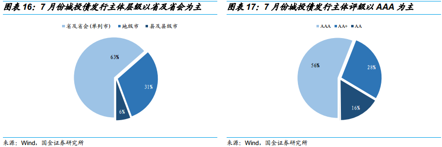 发行城投层级方面,7月省及省会(单列市)发行城投债金额占比过半,发行规模为1,216.91亿元,占比为63.52%,地级市的发行规模占比为30.79%;发行主体信用评级以AAA和AA+为主,AAA级的发行金额为1,072.53亿元,占比55.99%。