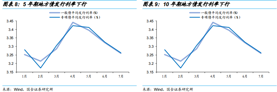 7月地方债发行利率继续下行。5年期一般债平均发行利率为3.26%,专项债平均发行利率为3.27%,较6月平均发行利率均回落6bp;10年期一般债平均发行利率为3.43%,专项债平均发行利率为3.42%,较6月份分别回落7bp和10bp。