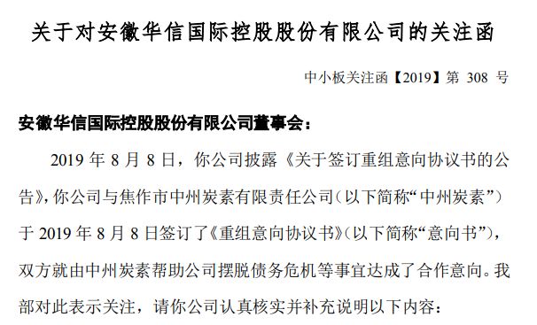 同时,针对该《重组意向协议书》,深交所要求*ST华信披露中州炭素包括组织架构、财务实力、人才储备等在内的简要情况,并详细说明中州炭素的主营业务和经营模式,分析是否与上市公司存在产品、客户、采购、技术等方面的协同效应。