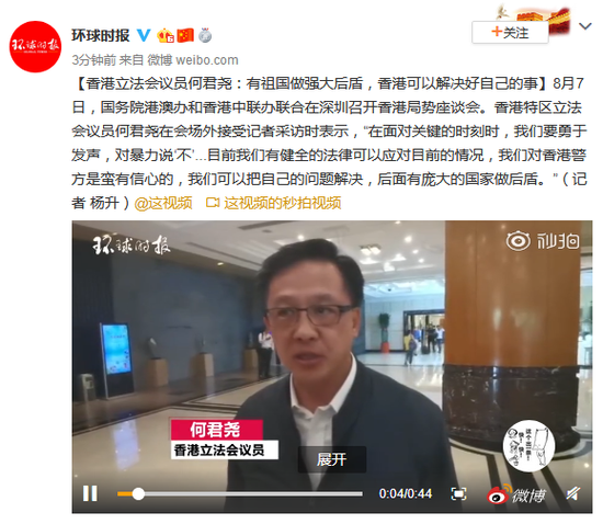 8月7日,国务院港澳办和香港中联办联合在深圳召开香港局势座谈会。香港特区立法会议员何君尧在会场外接受记者采访时表示,“在面对关键的时刻时,我们要勇于发声,对暴力说‘不’。。。目前我们有健全的法律可以应对目前的情况,我们对香港警方是蛮有信心的,我们可以把自己的问题解决,后面有庞大的国家做后盾。”(记者 杨升)
