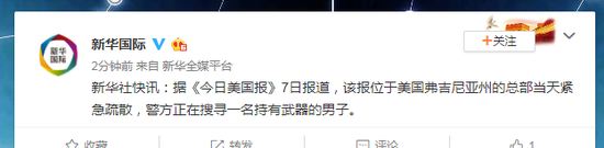 新华社快讯:据《今日美国报》7日报道,该报位于美国弗吉尼亚州的总部当天紧急疏散,警方正在搜寻一名持有武器的男子。