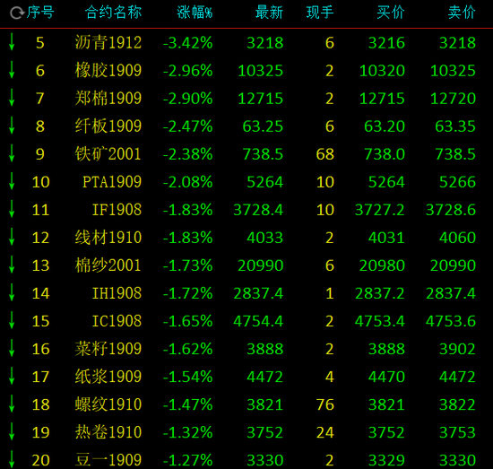 新浪财经讯 8月2日消息,商品期货早盘多品种下跌,受美隔夜外盘消息影响,能化板块与黑色系大跌,燃油跌逾4%,原油、沥青跌逾3%,橡胶、PTA跌逾2%,焦炭跌近4%,铁矿石跌逾2%;农产品走势分化,棉花跌近3%,豆一、菜籽跌逾1%,豆二、豆粕、棕榈、菜粕涨逾1%;有色板块飘绿。