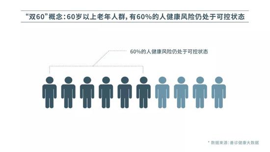 据悉,作为一家专注于中老年人的健康服务和风险管理平台,善诊对于中老年人的风险规律有着长期深入的研究。他们根据海量真实老年健康数据测算分析,提出了“双60”的概念,即60岁以上的老年人中,有超过60%的人,他们的健康风险仍处于可控状态,完全具备获得相对全面医疗保障的条件,剩余人群也有很大比例可以进行报销型重疾险保障。