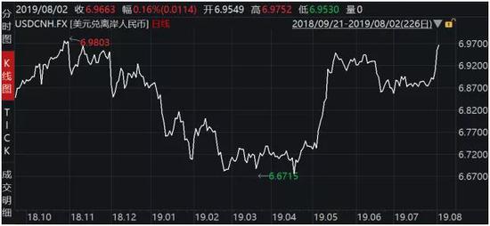 具体来看, 8月5日亚市盘初,离岸人民币兑美元即期汇率继续走弱。截至7:50,离岸人民币最低跌至6.9851元,创2017年1月4日以来新低,距2016年末低点只差不到30点。