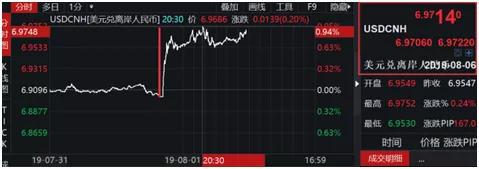 作为更能体现市场预期的离岸人民币汇率随即跌穿“7”关口。9时30分开盘后,人民币对美元即期汇率也跌破“7”这一心理关口。