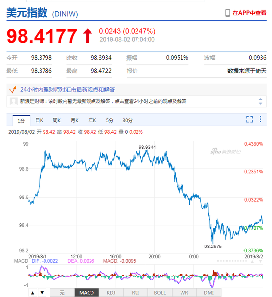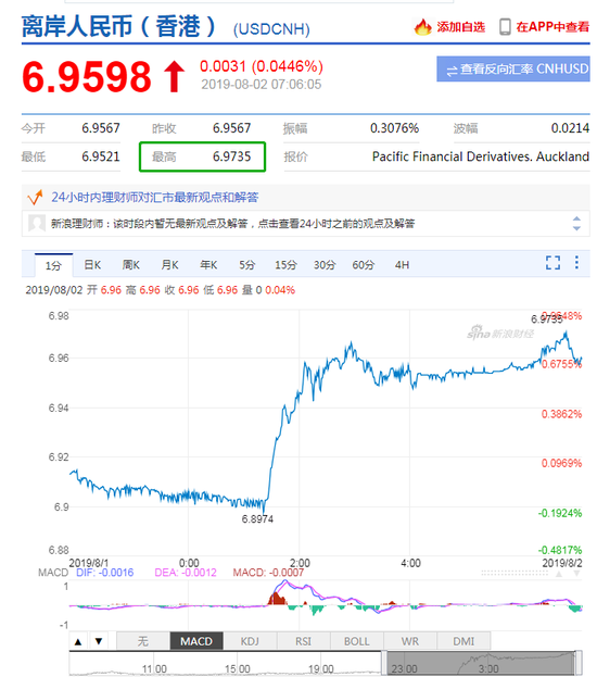 新浪财经讯 8月2日,美元冲高回落,盘中一度创逾两年新高98.93,离岸人民币持续走弱,一度失守6.97关口。