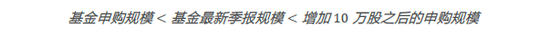 我们可以合理推断基金的申购已经达到了自身的规模上限,基金的实际规模介于基金申购规模和增加10万股之后的申购规模之间,接近基金最新季报公布的基金规模,也就是说自基金季报公布以来,基金规模没有太大的变动,如下: