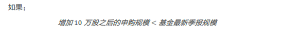 另外一种情况是,大部分情况下基金为了打新获利最大化,参加打新的基金会尽量提高申购数量,因此基金的申购数量一般会达到顶格申购水平。对于申购数量没有达到顶格申购水平的基金,可能的原因有:产品规模无法达到要求、指数型产品有跟踪误差限制、现金流压力较大或者单纯不看好该只个股仅做轻度参与等等。我们假设对于申购规模小幅度低于基金最近一期季报公布的基金规模的情况下,后两种原因所占比例较低,排除指数型产品,根据基金申报规模判断基金规模的方法如下:当基金申购数量没有达到顶格申购的水平的情况下,由于配售对象参与网下发行的申购数量超过规定下限的部分一般必须是10万股的整数倍,因此同时计算在基金实际申购数量基础上增加10万股之后的申购规模,并将基金实际申购规模、增加10万股之后的申购规模以及基金最新公布的季报中的规模数据进行对比,如果: