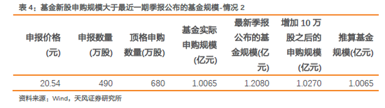 例如,某基金的二季报中公布了基金在2019年6月30日的基金规模为4320万元,然而在近期某新股的初步询价机构报价明细中,可以看到基金的申购规模达到了约9677万元,由于申购规模不得大于基金净资产规模,我们可以推断基金在申购该只新股的时间前后净资产规模至少达到了9677万元,也就是说基金的规模在最近一期的季报核算时点之后有了较大幅度的增加。