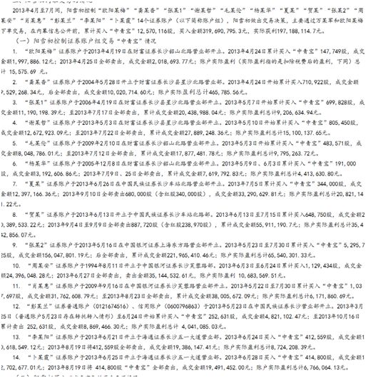据上述罚单信息显示,2013年4月至7月间,阳雪初控制“欧阳某梅”“龚某香”“张某1”“谢某哲”“毛某伦”“杨某华”“夏某”“贺某”“张某2”“周某安”“肖某惠”“彭某兰”“李某阳”“卜某霞”14个证券账户(以下简称账户组),阳雪初做出交易决策,主要通过万某军和欧阳某梅下单交易,在内幕信息公开前,累计买入“中青宝”1257万股,买入金额3.19亿元。