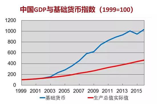 货币政策最重要的是货币发行,下图的红线是中国的经济增长线,蓝线是中国的货币供应线,蓝线大大超出了红线,这就是市场上所说的“货币超发”。