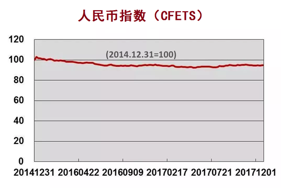 人民币指数是从2014年年底作为100,现在大概在95、96左右,所以我们可以看到虽然人民币对美元的汇率,从6到7感觉变化非常大,但人民币指数却是非常稳定的,且稳中有降;因为人民币是一篮子货币,美元在升值、在走强,所以一篮子货币对美元都有着不同程度的贬值走弱,相对来说是指数在往下调。