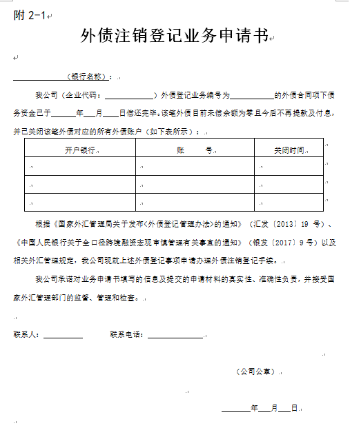 (一)外债注销登记业务申请书(见附2-1);