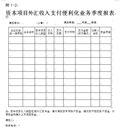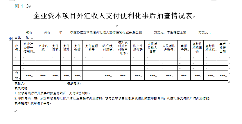 七、经办银行应于每季度初10个工作日内向所在地外汇局上报《资本项目外汇收入支付便利化业务季度报表》(见附1-2)及《企业资本项目外汇收入支付便利化业务事后抽查情况表》(见附1-3)。