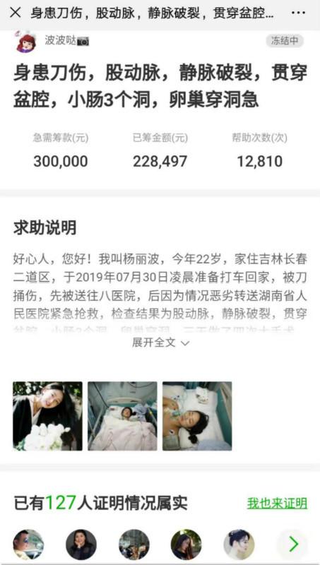 8月3日,小杨也在网上发起了轻松筹,求助说明中,介绍了事发时的大致经过。7月30日凌晨准备打车回家,被刀捅伤,先被送往八医院,后因为情况恶劣转送湖南省人民医院紧急抢救,检查结果为股动脉,静脉破裂,贯穿盆腔,小肠3个洞,卵巢穿洞,三天做了四次大手术,输血3000CC(正常人只有4800CC),高额的费用让原本不太富裕的家庭陷入了绝境,目前仍然住院观察治疗,现在已经花去12万整,后面还需要一系列的治疗以及康复的费用,还需要18万合计30万费用。家庭的经济实力已难以支撑下去,才发起筹款。