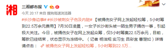 三湘都市报·新湖南客户端8月3日讯(记者 杨洁规 实习生 吕彩宜 曹楚如)7月30日凌晨,一女子长沙街头被一陌生男子捅伤一事,引起极大关注。今日,被捅伤女子在网上发起众筹,仅5小时筹集22.5万余元,目前,筹款已经结束,状态显示为冻结中。