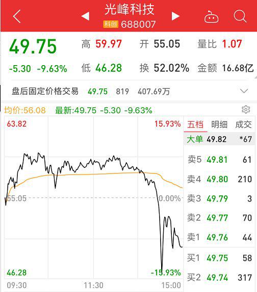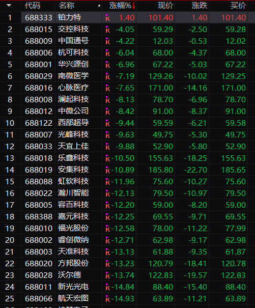 今日收盘,25只科创板股票仅有1只铂力特上涨1.4%,13只跌幅超10%,航天宏图、新光光电跌近15%。这些股票基本都是尾盘大跳水。