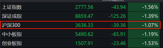 主要指数中,深证成指跌1.39%,创业板指数跌1.19%,权重的上证50指数仅下跌0.93%,沪深300指数跌幅也仅为1.07%。