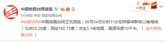 中国地震台网正式测定:08月04日02时11分在阿留申群岛以南海域(北纬52.26度,西经165.75度)发生5.1级地震,震源深度10千米。