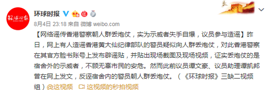 [网络谣传香港警察朝人群丢炮仗,实为示威者失手自爆,议员参与造谣]昨日,网上有人造谣香港黄大仙纪律部队的警员疑似向人群丢炮仗,对此香港警察在其官方脸书账号上发布辟谣贴,并贴出现场截图及现场视频,证实丢炮仗的是宿舍外的示威者,不顾无辜市民的安危。然而此前议员谭文豪、议员助理谭凯邦曾在网上发文,反诬宿舍内的警员朝人群丢炮仗。