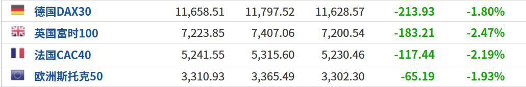 此前,亚洲、欧洲主要股市周一也全线重挫,贸易紧张局势令全球投资者都感到不安。欧洲股市方面,欧洲STOXX 600指数收跌2.31%,创下今年2月以来新低。欧洲斯托克50指数下跌1.93%;德国DAX30指数收盘下跌近1.8%;英国富时100指数收盘下跌2.47%;法国CAC40指数收盘下跌2.19%。