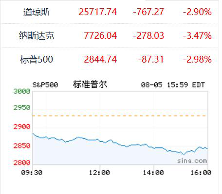 美股周一大幅收跌,主要股指齐创今年以来最大单日跌幅。北京时间8月6日凌晨4时美股收盘,道琼斯工业平均指数收跌767.27点或2.90%,报25717.74点,盘中跌幅一度接近1000点;标普500指数跌87.31点或2.98%,报2844.74点;纳斯达克综合指数跌278.03点或3.47%,报7726.04点。