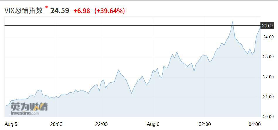 市场恐慌情绪大增,衡量市场恐慌程度的芝加哥期权交易所波动率指数(VIX)周一飙升逾39%,截至美股收盘报24.59。
