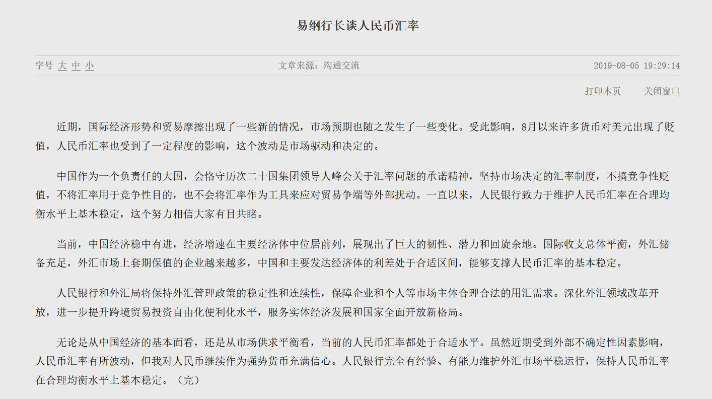 8月5日,离岸、在岸人民币对美元汇率双双“破7”引发关注。8月5日晚间,中国人民银行官网还发布了《易纲行长谈人民币汇率》文章,易纲表示,中国作为一个负责任的大国,会恪守历次二十国集团领导人峰会关于汇率问题的承诺精神,坚持市场决定的汇率制度,不搞竞争性贬值,不将汇率用于竞争性目的,也不会将汇率作为工具来应对贸易争端等外部扰动。一直以来,人民银行致力于维护人民币汇率在合理均衡水平上基本稳定,这个努力相信大家有目共睹。