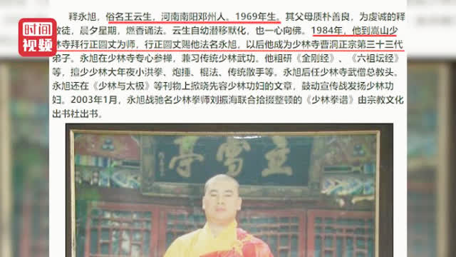 工商资料显示,释永旭曾创办少林寺禅武学院,并自称“嵩山少林寺第三十三代嫡传弟子、曾任武僧总教头”。