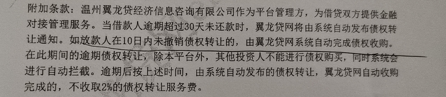 法院开庭中,刘东明白了后面一个疑点。原来,当年他从翼龙贷上借钱时,所签的《借条》有一个附加的格式条款:当借贷人逾期超过30天未还款时,翼龙贷将由系统自动发布债权转让通知,如放款人在10日内未撤销债权转让,由翼龙贷自动完成债权收购。