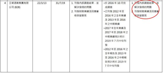 3月26日,王朝酒业公告称公司董事会已授权罗兵咸永道审核委员会进行调查,而审核委员会委托法律顾问及独立会计师事务所安永咨询服务有限公司(以下简称“安永”)进行内部调查。10月8日公司公告称,联交所已向公司发出复牌条件:1.开发所有尚未刊发财务业绩,说明任何审核保留意见;2.刊发内部调查结果,并就任何问题提供说明。