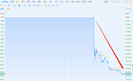 智通财经APP观察到,于2013年停牌的王朝酒业,终于在今年7月29日复牌了。然而出师未捷身先死,相较停牌日收盘价1.44港元,29日直接低开17个点,开盘不到5分钟跌去40%,收盘下跌52%报0.69港元;30日再次低开低走,收盘跌去24.6%报0.52港元。