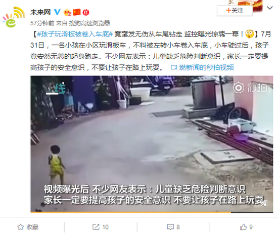 [#孩子玩滑板被卷入车底# 竟毫发无伤从车尾钻走 监控曝光惊魂一幕! ]7月31日,一名小孩在小区玩滑板车,不料被左转小车卷入车底,小车驶过后,孩子竟安然无恙的起身跑走。不少网友表示:儿童缺乏危险判断意识,家长一定要提高孩子的安全意识,不要让孩子在路上玩耍。