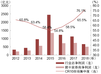 图5:证券行业2012-2018年市场集中度(净利润CR10)变化