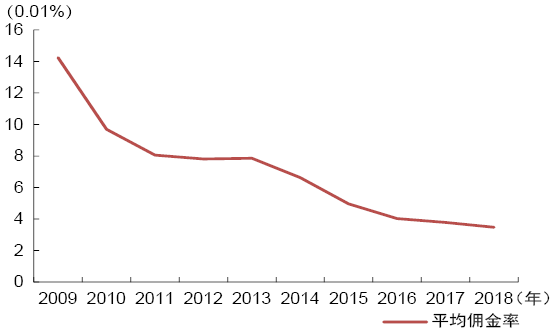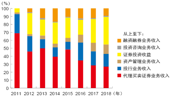 国内券商的主要盈利来源之一是经纪业务,但经历了十年佣金竞争后,同质化严重的传统经纪业务已成为红海市场。2018年股基交易量较2008年已增加近4倍,但2018年代理买卖证券净收入较2008年反而下降了29.32%。可见经过行业保底佣金放开、“一人多户”政策刺激和网上销户的实施,经纪业务市场目前已高度市场化,进入了存量竞争阶段。为了应对经纪业务激烈的市场竞争,券商纷纷通过降低佣金费率的方式抢占市场份额,同时随着网上开户的普及和券商互联网技术的运用,经纪业务佣金率进一步下滑。2018年行业平均佣金率降至3.48?,对比国际市场均处于很低的水平。如香港市场股票平均交易佣金费率约为成交金额的2.5‰;日本传统券商佣金率8‰,网络券商佣金率0.4‰。佣金率持续下滑导致券商盈利能力不断下降,行业龙头中信证券销售净利率在2008年至2010年期间平均达45%,而2016年至2018年期间平均已下降到27%。中小券商下滑趋势更为严重,西部证券相应期间平均销售净利率从40%降为22%。佣金下滑也导致了经纪业务收入占收入总额比例发生了明显的变化,2016年受制于两市交易量的萎缩,经纪业务占比较2015年下降了近14个点,2017年和2018年证券投资业务收入甚至超过了经纪业务收入(见图1、图2)。