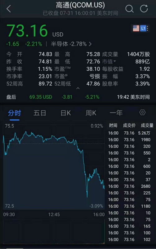 财报公布后,高通股价盘后跌幅一度接近6%。不过在此之前,今年以来高通股价已经累涨约30%,过去12个月涨15%。