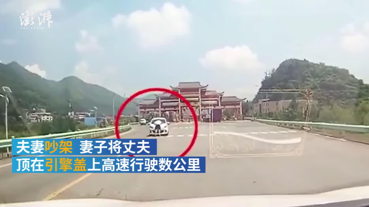 8月1日,贵州毕节。一对夫妻因感情问题吵架,丈夫被妻子顶在引擎盖上,在高速公路上行驶数公里才停车。幸民警及时处置,未造成伤亡。
