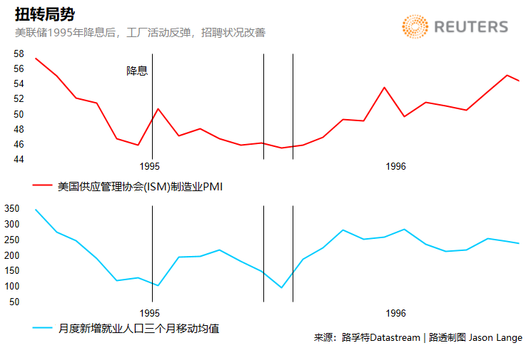 1995年7月,美国工业生产和就业增长放缓,新增申领失业金人数攀升。尽管美联储决策者当时并不相信这些数据意味着衰退到来,但也不想坐等一看究竟。他们降息了三次,制造业和就业市场因此都得到重振。