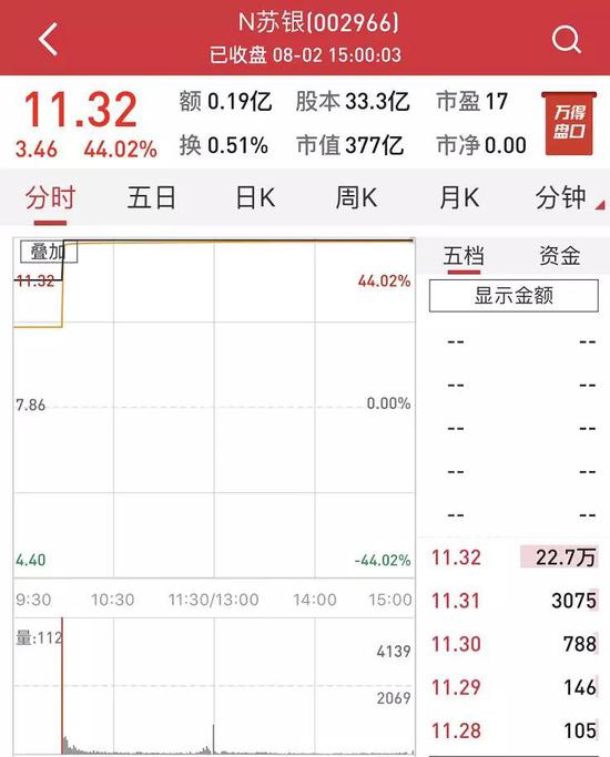 苏州银行(002966.SZ)本次公开发行约3.33亿股,发行价格为7.86元/股,今日收盘大涨44.02%,报收11.32元。